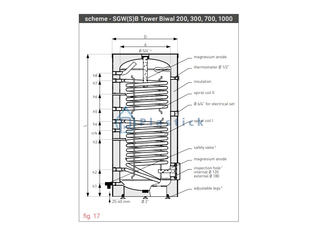 ⭐ Obnoviteľná slnečná energia je zdrojom bezplatného a čistého tepla dostupného počas celého roka. Používa sa na vykurovanie a umožňuje výrazne znížiť náklady na zabezpečenie teplej úžitkovej vody. Konštrukcia výmenníka Tower Biwal umožňuje maximálne využitie tejto čistej energie. Teplo získané solárnymi kolektormi sa prenáša do úžitkovej vody prostredníctvom špirálovej hadice určenej pre solárne kolektory. Umiestnenie jej do spodnej časti nádrže umožnilo zabezpečiť prevádzku výmenníka s najvyššou účinnosťou. Prácu dolnej hadičky môže podporiť hadička umiestnená nad ňou, napájaná kotlom ústredného kúrenia. To skracuje dobu ohrevu vody, najmä pri vysokej potrebe teplej úžitkovej vody. Súčasne môže fungovať aj izolovaný elektrický vykurovací systém GE alebo riad ohrievačov na flanše, ktorý je inštalovaný v revíznom otvore.