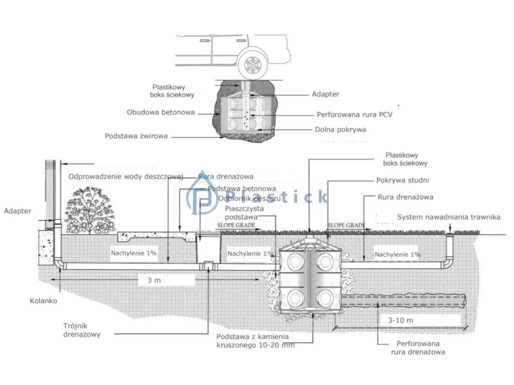 Plastová retenčná a drenážna studňa – poskytuje ľahko inštalovateľné a odolné riešenie pre manažment dažďovej vody.