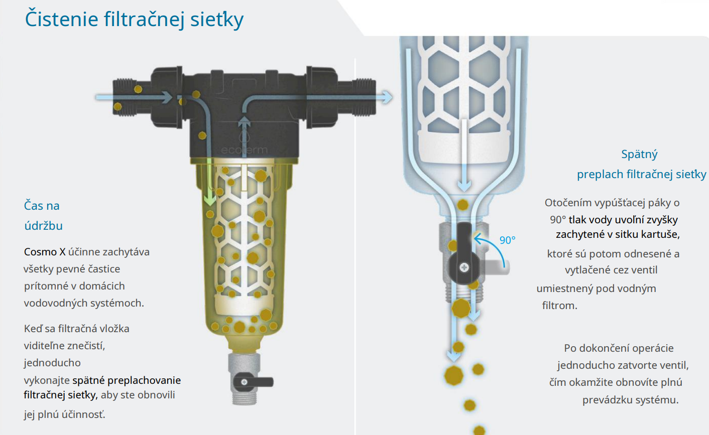 Samočistiaci systém Backwash – protiprúdové oplachovanie účinne odstráni usadeniny bez nutnosti demontáže.