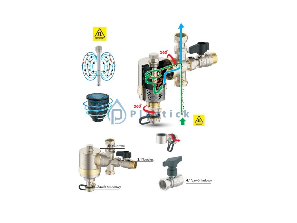 Prvým prvkom, ktorý umožňuje filtrovať feromagnetické nečistoty (separácia magnetitu), je magnet so silou 9000 Gaussov namontovaný na vonkajšej strane telesa. Ďalším prvkom, ktorý umožňuje separáciu nemagnetických pevných nečistôt, je kazeta vo forme filtračnej sieťky vyrobenej z mosadze. Filtračná komora má väčší priemer ako trysky, čo umožňuje lokálne spomalenie prietoku kvapalín vo vnútri filtra, a tým spomaľuje nečistoty v kvapaline.
