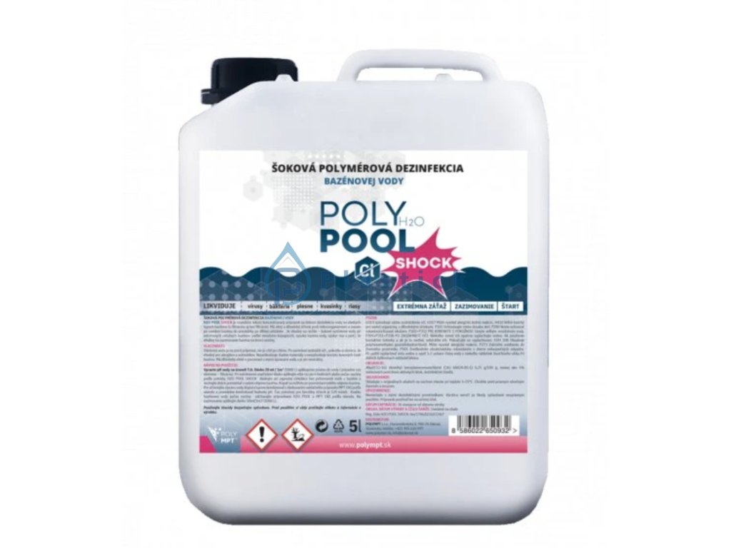POLY POOL SHOCK je tekutý vysoko koncentrovaný dezinfekčný prostriedok, ktorý je určený na šokovú dezinfekciu bazénovej vody. Chémia do bazéna je charakteristická svojim výrazným účinkom proti baktériám, riasam, vírusom a plesniam. Je vhodný pre všetky typy bazénov s filtráciou i bez filtrácie a v kombinácii s dávkovaním MPT OXI zabezpečí rýchlu a účinnú dezinfekciu.