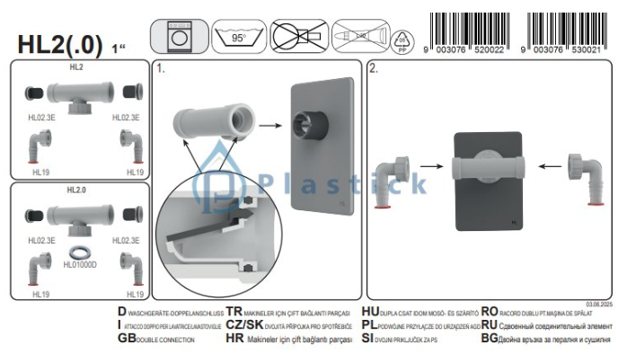 Pripojovací diel HL2 je určený na súčasné napojenie dvoch umývacích zariadení (napr. práčky a umývačky riadu) na spoločný odtokový systém. Zabudovaná spätná klapka poskytuje účinnú ochranu proti spätnému toku odpadovej vody, čím zabraňuje vzájomnému ovplyvňovaniu spotrebičov aj možným znečisteniam.