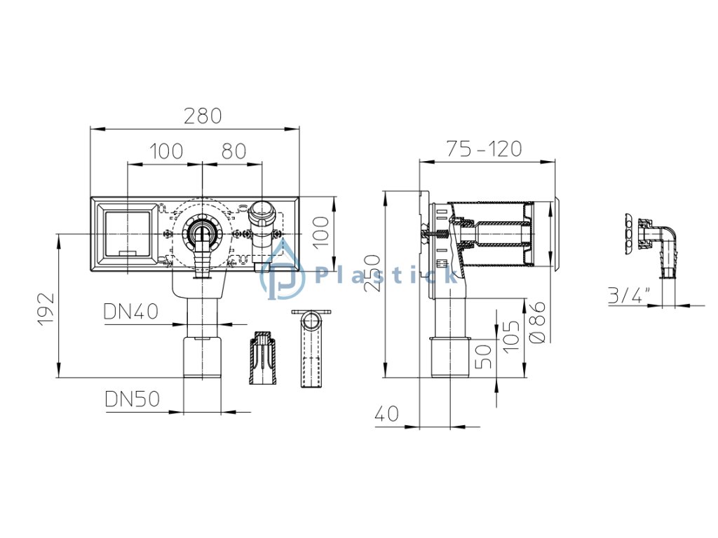 HL406E – Podomietkový zápachový uzáver pre umývačky a práčky DN40/50 s pripojením vody a elektrickou zásuvkou, 280 × 100 mm