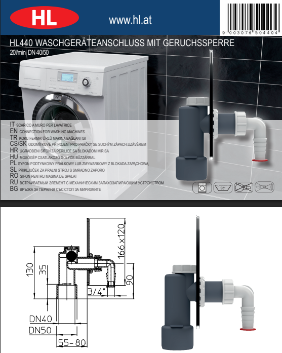 HL440 je zápachový uzáver určený pre práčky, umývačky riadu a ďalšie umývacie zariadenia. Slúži na bezpečné a hygienické napojenie výpustnej hadice na kanalizáciu tak, aby sa zabránilo spätnému úniku zápachov. Kompaktné prevedenie umožňuje jednoduchú montáž na stenu alebo do inštalačného priestoru pri spotrebiči.
