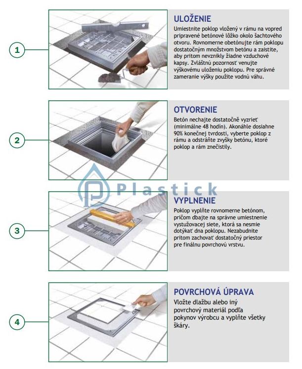Pred montážou skontrolujte rozmer výkopu — rozmery rámu a výplne musia zodpovedať vašim stavebným otvorom. Vzhľadom na vyššiu hmotnosť (naplneného poklopu) odporúčame zabezpečiť pevné ukotvenie rámu. Produkt je vhodný ako trvanlivé riešenie pre exteriéry, kde sa vyžaduje odolnosť voči poveternostným podmienkam a zaťaženiu.