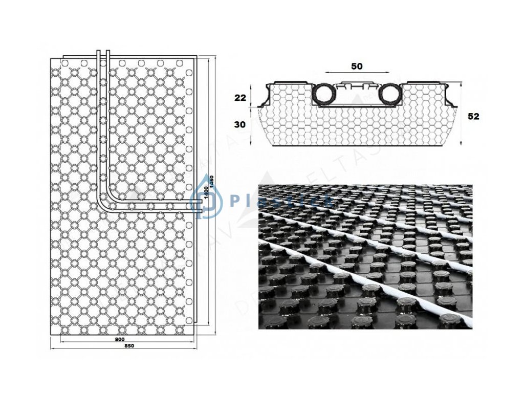 - vo vnútornej časti dosky sú 5 mm drobné výstupky, ktoré zabezpečujú, aby bolo potrubie dokonale obalené zálievkovou hmotou