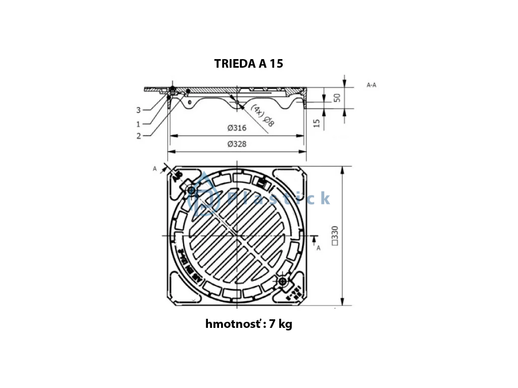 Trieda A15: Vhodná pre plochy s nízkym zaťažením – napr. v okolí rodinných domov, záhrad, parkov alebo chodníkov. Rám a mreža zo šedej liatiny.