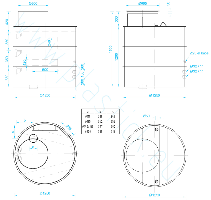 - Otvor v šachte na vŕtanú studňu, ktorý si vyberáte podľa rozmeru potrubia aký máte (priemer otvoru podľa vášho výberu 110; 125; 140; 160; 200) je umiestnený excentricky akoby na kraji revízneho vstupu do šachty (viď výkres).