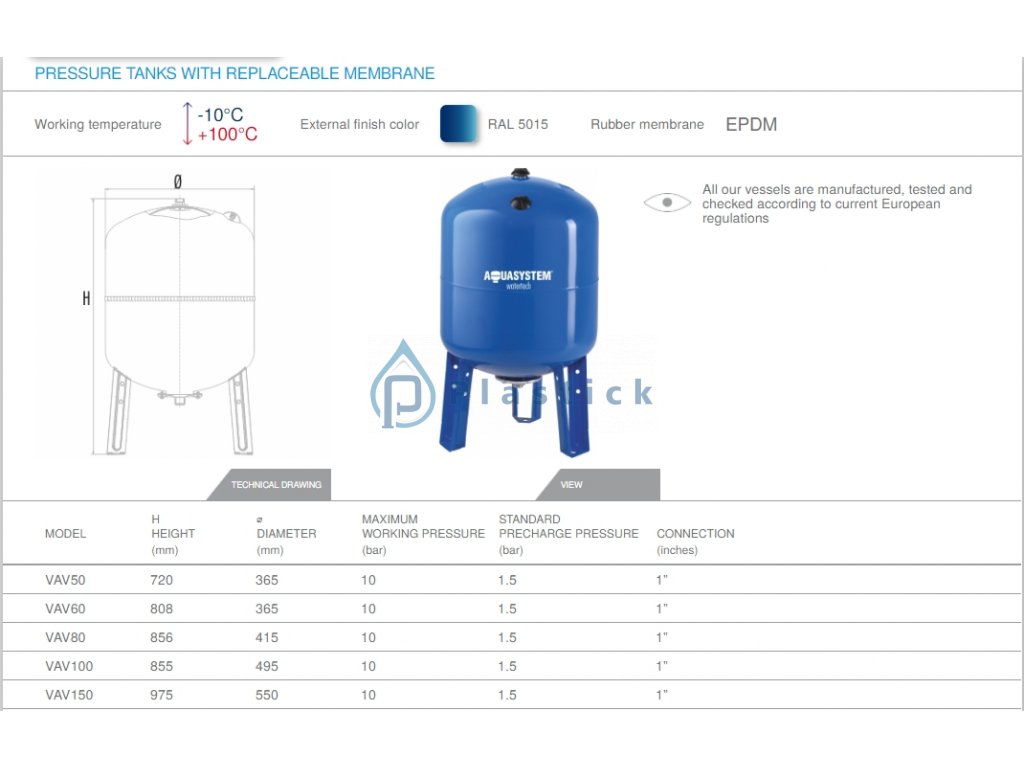 Tlaková nádoba IMERA/AQUASYSTEM VAV80 s vymeniteľným gumovým vakom je určená pre domáce vodárne, verejné rozvody vody, zavlažovacie systémy, zásobovanie rôznych objektov vodou.