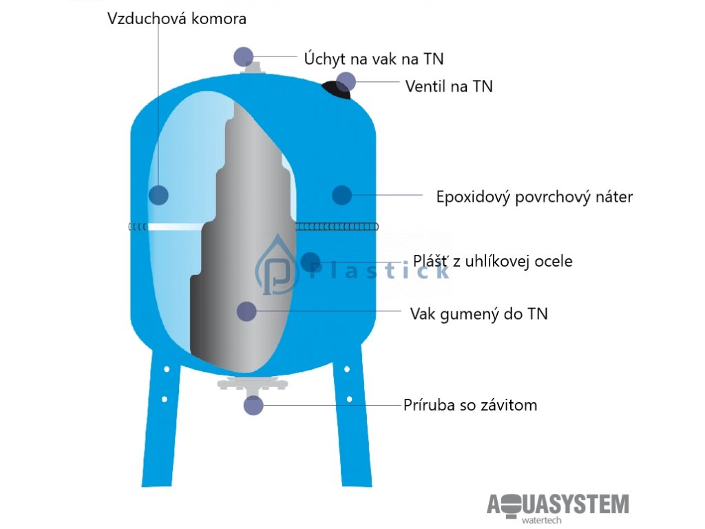 Zásobníky sú vyrobené z kvalitného oceľového plechu, do ktorých sú montované vaky z EPDM. Voda je v gumovom vaku a neprichádza do styku s oceľovým plechom,čo predlžuje životnosť nádrže a zabezpečuje zdravotnú nezávadnosť vody. Priestor medzi gumovým vakom a oceľovým plášťom je vyplnený vzduchovým vankúšom. Vzduch sa plní cez ventil, na predpísaný tlak. Zásobníky sú vyrábané podľa ISO 9002.
