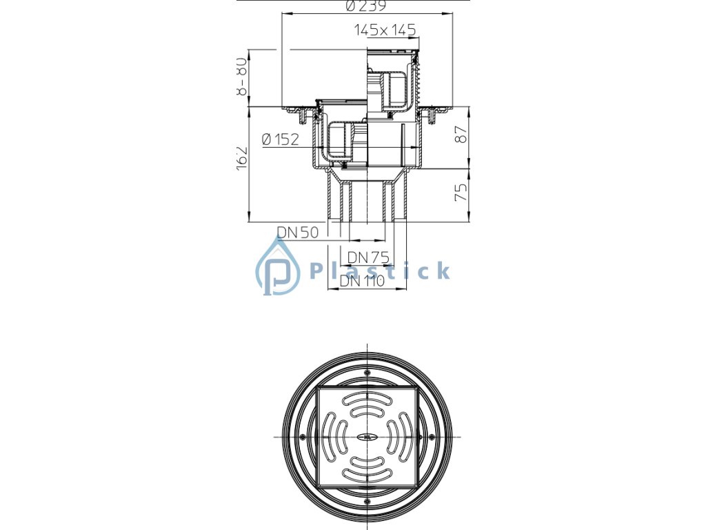 HL3100Pr Podlahový vpust DN50/75/110 vertikálny so zápachovým uzáverom "Primus", 145x145mm, KLICK-KLACK/138x138mm