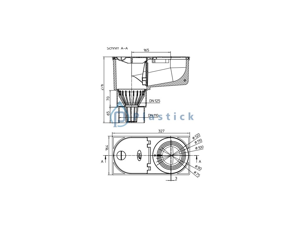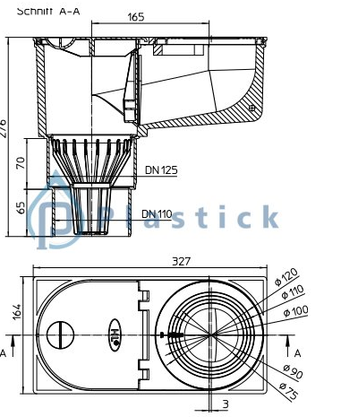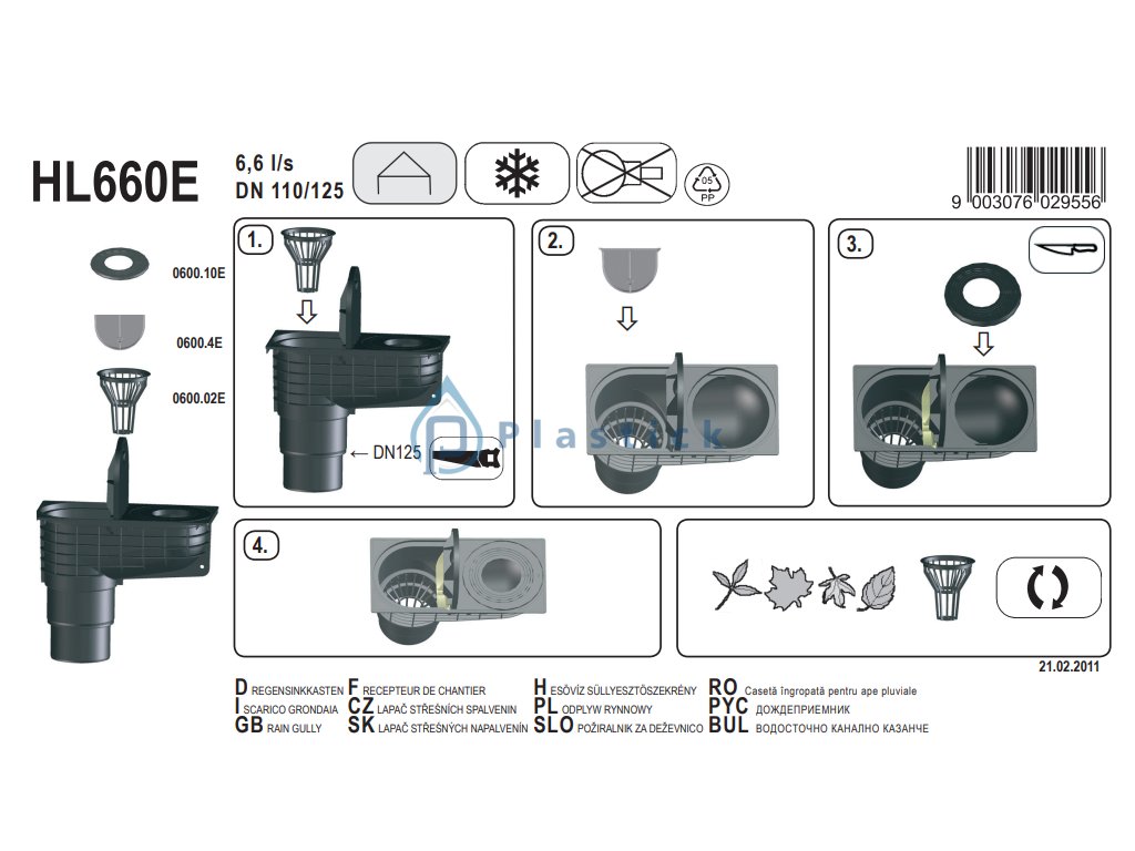 HL660E Lapač strešných naplavenín so zvislým vstupom na rôzne priemery potrubí a zvislým výstupom na DN110/125