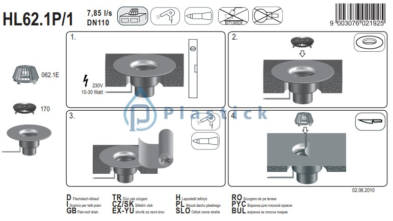 HL62.1P/1 – Strešný vpust DN110 s PVC límcom a elektrickým ohrevom 10–30 W / 230 V