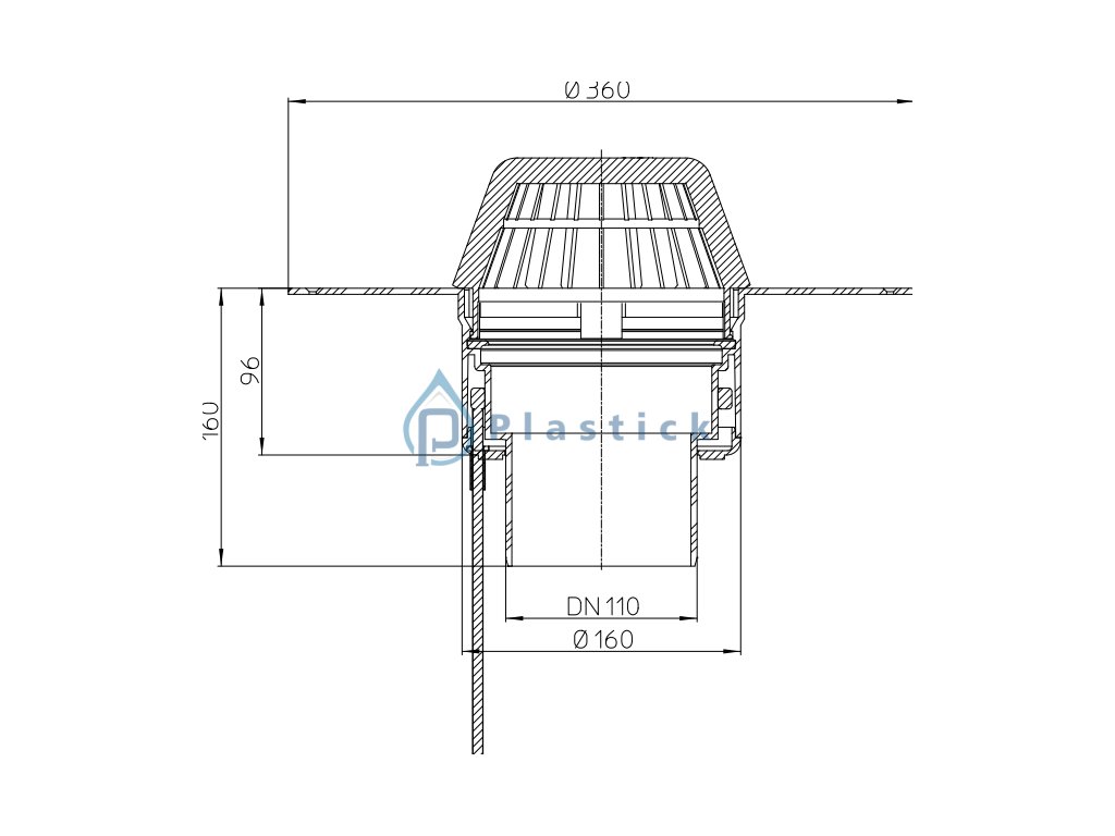 Vpust je doplnený o elektrický vyhrievací systém s výkonom 10–30 W (230 V), ktorý zabraňuje zamŕzaniu vody v odtokovom hrdle a zabezpečuje plnú funkčnosť aj počas zimných mesiacov. Robustné plastové telo a odtok DN110 poskytujú vysokú priepustnosť a dlhú životnosť.