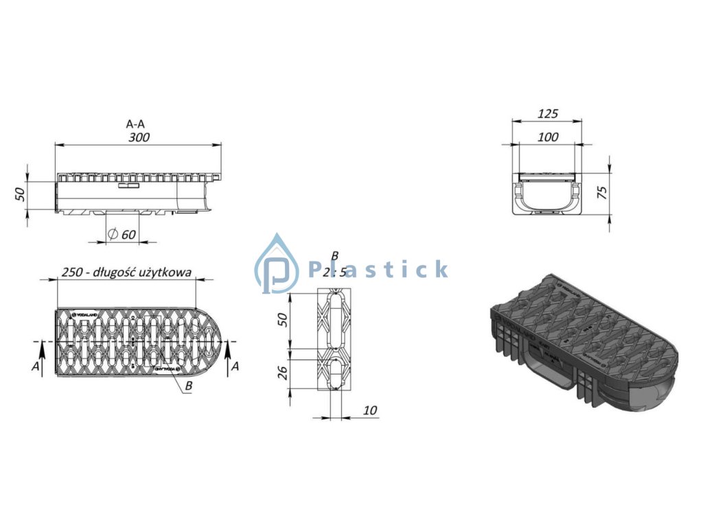 VO EASY 2 otočný plastový žľab 300 x 125 x 70mm plastový rošt A15 (R1 - začiatočný)